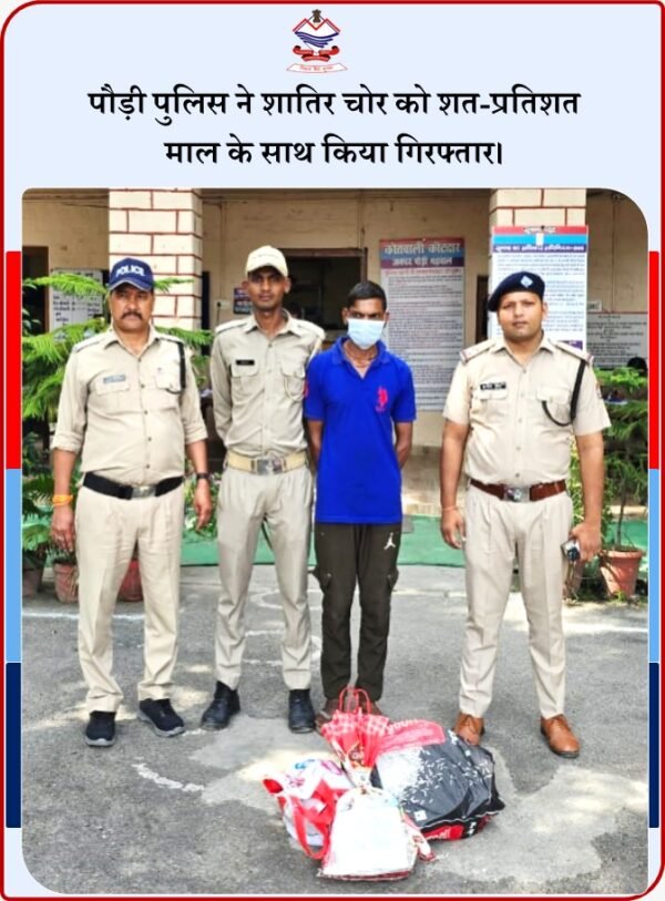 कोटद्वार। कोतवाली पुलिस ने एक शातिर चोर को शत प्रतिशत माल के साथ गिरफ्तार करने का दावा किया है। सोमवार को स्थानीय एक महिला ने उनके घर में हुई घरेलू सामान के चोरी होने की तहरीर कोटद्वार पुलिस को दी थी। वरिष्ठ पुलिस अधीक्षक पौड़ी लोकेश्वर सिंह द्वारा चोरी की उक्त घटना का शीघ्र खुलासा किए जाने के निर्देश पर कोतवाली प्रभारी निरीक्षक कोटद्वार रमेश तनवर के नेतृत्व में गठित पुलिस टीम द्वारा सीसीटीवी कैमरों की मदद से चोरी में संलिप्त अभियुक्त आमपड़ाव निवासी सलमान पुत्र खलील को शत-प्रतिशत माल के साथ आमपड़ाव स्कूल पनियाली स्रोत पुल के पास से गिरफ्तार किया गया। पुलिस के अनुसार अभियुक्त सलमान के विरुद्ध कोतवाली कोटद्वार में लगभग आधा दर्जन मुकदमे दर्ज हैं, उसके अन्य अपराधिक इतिहास की जानकारी की जा रही है। पुलिस टीम में अपर उपनिरीक्षक मनोज सिंह, मुख्य आरक्षी करण कुमार शामिल थे।