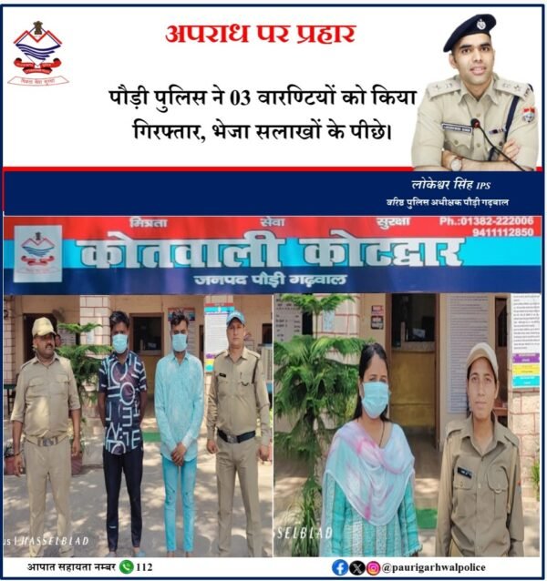 कोटद्वार। वरिष्ठ पुलिस अधीक्षक पौड़ी लोकेश्वर सिंह ने सभी थाना प्रभारियों को न्यायालय से प्राप्त गैर जमानती वारण्ट की शत प्रतिशत तामील कर अभियुक्त को गिरफ्तार कर न्यायालय के समक्ष पेश किये जाने हेतु कड़े निर्देश दिये गये हैं। जिसके तहत रविवार को कोटद्वार पुलिस टीम ने न्यायालय न्यायिक मजिस्ट्रेट कोटद्वार के निर्गत एनबीडब्ल्यू से सम्बन्धित रसीदिया मस्जिद, लकड़ी पड़ाव निवासी वारंटी रूबीना पुत्री अब्दुल कय्यूम, कासिम पुत्र अब्दुल कय्यूम और नाजीम पुत्र अब्दुल कय्यूम को बस अड्डा कोटद्वार से गिरफ्तार कर न्यायालय के समक्ष पेश कर आवश्यक कार्यवाही की गई।