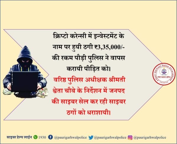 कोटद्वार। वरिष्ठ पुलिस अधीक्षक पौड़ी श्वेता चौबे के निर्देशन में साइबर ठगी के शिकार हुए व्यक्ति को 3 लाख 35 हजार रुपए की रकम साइबर सेल ने वापस दिलाई । न्यू मार्केट स्टेशन रोड़ कोटद्वार निवासी संचित अग्रवाल ने कोटद्वार साइबर सेल को दिए शिकायती पत्र में बताया कि उनके साथ किसी अज्ञात व्यक्ति ने क्रिप्टो करेन्सी में इन्वेस्टमेंट करने का झाँसा देकर 3 लाख 35 हजार रुपए की ठगी की गई है। जिस पर वरिष्ठ पुलिस अधीक्षक श्वेता चौबे ने प्रकरण का तत्काल संज्ञान लेते हुये प्रभारी साइबर सेल को त्वरित कार्यवाई करने के निर्देश दिए गए। साइबर सेल ने त्वरित कार्रवाई करते हुये सम्बन्धित पैमेन्ट गेटवे, बैंक नोडल से पत्राचार कर शिकायत कर्ता के खाते से कटी 3 लाख 35 हजार रुपए की धनराशि उसके खाते में वापस कराई गई।