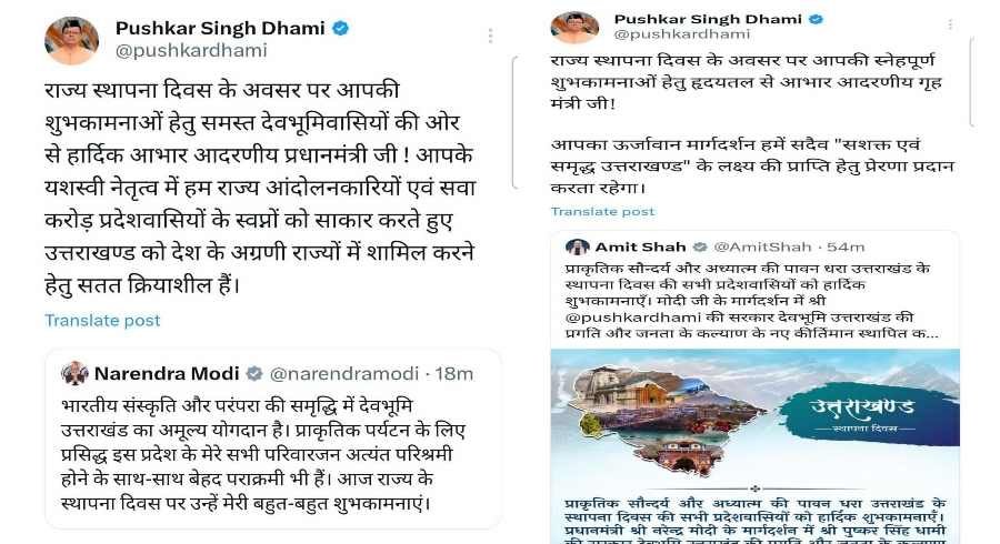 वहीं सीएम धामी ने प्रदेशवासियों की ओर से पीएम मोदी का आभार जताते हुए कहा कि, ‘राज्य स्थापना दिवस के अवसर पर आपकी शुभकामनाओं हेतु समस्त देवभूमिवासियों की ओर से हार्दिक आभार आदरणीय प्रधानमंत्री जी ! आपके यशस्वी नेतृत्व में हम राज्य आंदोलनकारियों एवं सवा करोड़ प्रदेशवासियों के स्वप्नों को साकार करते हुए उत्तराखण्ड को देश के अग्रणी राज्यों में शामिल करने हेतु सतत क्रियाशील हैं।’