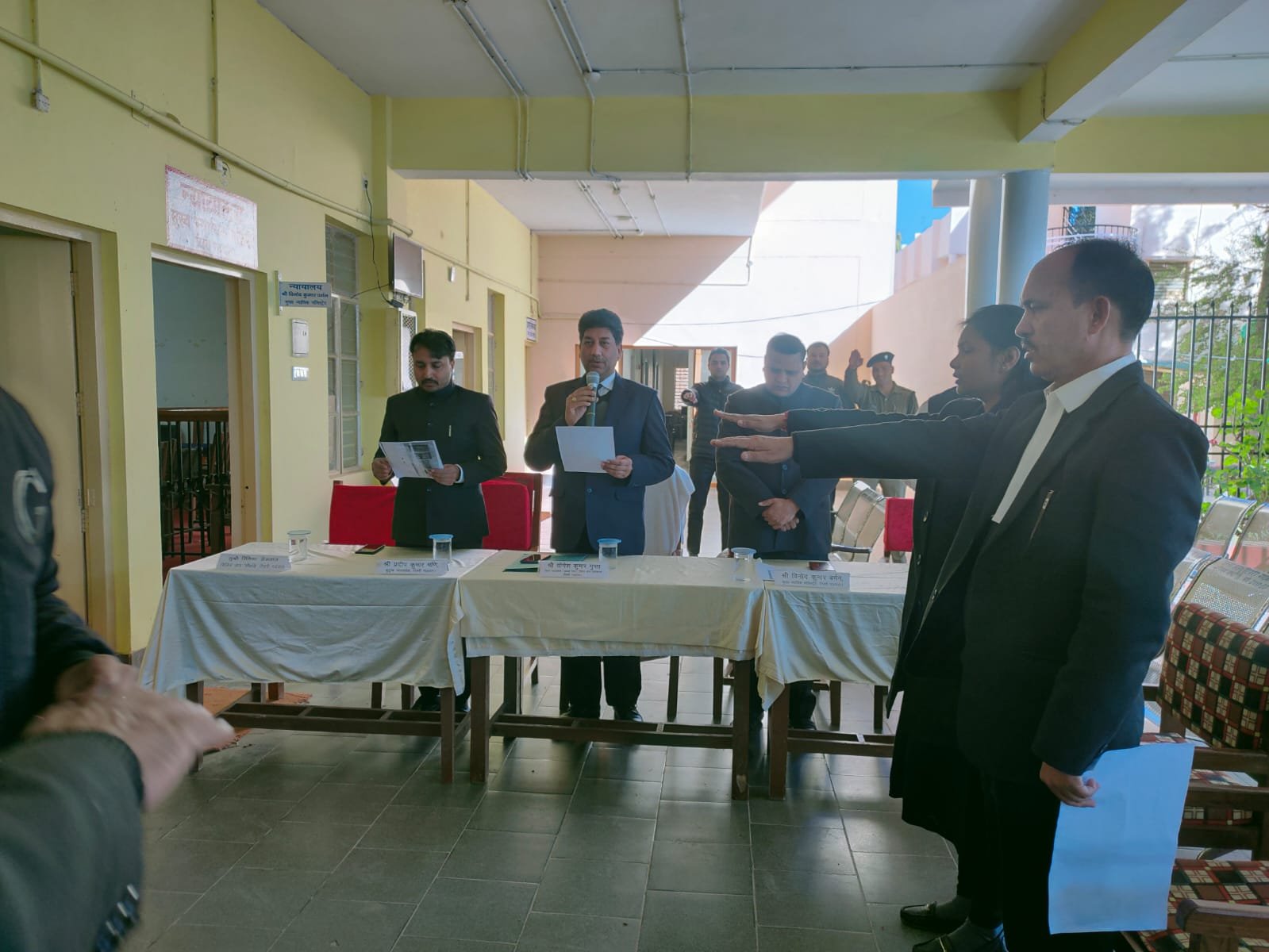 टिहरी : राज्य विधिक सेवा प्राधिकरण नैनीताल के निर्देश अनुपालन में जिला विधिक सेवा प्राधिकरण टिहरी गढ़वाल के तत्वाधान में आज जिला न्यायालय परिसर टिहरी गढ़वाल में न्यायाधीश जनपद टिहरी गढ़वाल योगेश कुमार गुप्ता की अध्यक्षता में संविधान दिवस का आयोजन किया गया। कार्यक्रम में न्यायाधीश द्वारा संविधान की उद्देशिका का पाठ की शपथ दिलवाई गई। न्यायाधीश ने सभी को संविधान दिवस की बधाई देते हुए कहा कि हमारा भारत एक लोकतांत्रिक देश है, जो भारतीय संविधान के अनुसार चलता हैं, जिसके मुताबिक देश का प्रत्येक नागरिक एक समान है, कोई छोटा और ना ही कोई बड़ा है और कानून से और संविधान से बड़ा देश में कोई नहीं है, सभी को संविधान और कानून का पालन करना अनिवार्य है। कार्यक्रम का संचालन सचिव जिला विधिक सेवा प्राधिकरण टिहरी गढ़वाल ममता पंत द्वारा किया गया। इस अवसर पर न्यायाधीश परिवार न्यायालय प्रदीप कुमार मणि, मुख्य न्यायिक मजिस्ट्रेट टिहरी गढ़वाल विनोद कुमार बर्मन, सीनियर सिविल जज टिहरी गढ़वाल रितिका सेमवाल, सिविल जज टिहरी निशा देवी, अध्यक्ष जिला बार एसोसिएशन टिहरी गढ़वाल संजय कुमार घिल्डियाल सहित जिला न्यायालय टिहरी गढ़वाल के समस्त कर्मचारी गण, अधिवक्ता गण आदि उपस्थित थे।