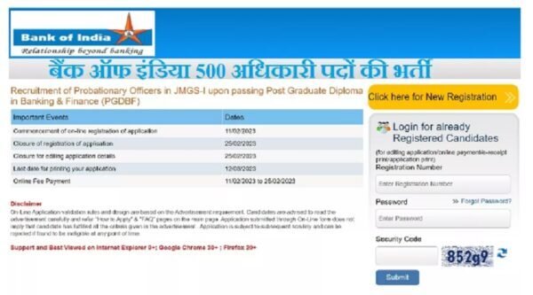 दिल्ली : बैंक में सरकारी नौकरी के इच्छुक या बैंक में अधिकारी पदों पर भर्ती के मौकों का इंतजार कर रहे उम्मीदवारों के लिए काम की खबर। बैंक ऑफ इंडिया द्वारा जनरल बैंकिंग स्ट्रीम में क्रेडिट ऑफिसर और स्पेशलिस्ट स्ट्रीम में IT ऑफिसर के कुल 500 पदों पर भर्ती के लिए आवेदन आमंत्रित किए जा रहे हैं। आवेदन की यह प्रक्रिया शनिवार, 25 फरवरी 2023 को समाप्त होने जा रही है। ऐसे में जबकि आवेदन में सिर्फ एक दिन का समय बाकी है, इच्छुक व योग्य उम्मीदवारों को अंतिम क्षणों का इंतजार किए बिना जल्द से जल्द अप्लाई कर लेना चाहिए।