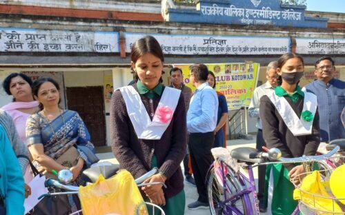 कोटद्वार । रोटरी क्लब कोटद्वार के तत्वावधान मे बालिकाओं की पढ़ाई में सुविधा हेतु उनके विद्यालय आने जाने की परेशानियों को देखते हुए रोटरी दिव्य बालिका श्री योजना के तहत प्रथम चरण मे स्कूल की 06 छात्राओं को साईकिल बांटने का कार्यक्रम आयोजित किया गया। रविवार को कार्यक्रम का शुभारम्भ रोटरी अध्यक्ष मनीष अग्रवाल ने किया। इस अवसर पर उन्होने बताया कि मेधावी छात्राओं की पढ़ाई में सहयोग के लिए रोटरी क्लब ने साईकिल देने की योजना शुरू की है जिससे बालिका शिक्षा को बढ़ावा देने पर जोर दिया जा सके।