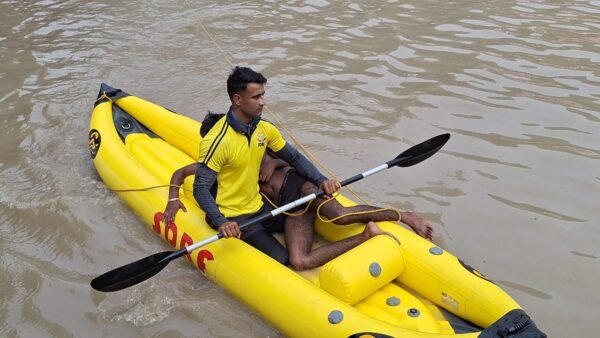 हरिद्वार : जनपद हरिद्वार-कांगड़ा पुल के पास डूबते कांवड़िये के लिए देवदूत बना SDRF जवान। आज 05 जुलाई 2023 को जनपद हरिद्वार में कांगड़ा पुल के पास एक कांवड़िया गंगा नदी के किनारे नहाते समय अचानक अनियंत्रित होकर नदी के तेज बहाव की चपेट में आकर डूबने लगा। कांगड़ा पूल पर पूर्व से ही मौजूद SDRF टीम के जवान आशिक अली द्वारा डूबते युवक को देखकर तत्काल प्रतिवादन करते हुए राफ्ट के माध्यम से युवक मंजीत उम्र – 22 वर्ष, निवासी – मानेश्वर, हरियाणा को सकुशल बाहर निकाला व उसके जीवन को सुरक्षित किया।