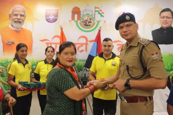 देहरादून : SDRF उत्तराखंड पुलिस को बहनों ने बांधे रक्षा सूत्र, वाहिनी मुख्यालय में धूमधाम से मनाया गया रक्षाबंधन पर्व। आज 29 अगस्त 2023 को रानीपोखरी क्षेत्र की स्थानीय महिलाओं तथा सामाजिक कार्यकत्रियों द्वारा कमान्डेंट SDRF मणिकांत मिश्रा व वाहिनी में उपस्थित अन्य कार्मिकों को रक्षा सूत्र #राखी बांधते हुए पावन रक्षाबंधन पर्व मनाया गया। इस पर्व को हर्षोल्लास से मनाए जाने के दौरान सभी का एक-दूसरे के प्रति प्रेम व उत्साह देखने योग्य रहा। बहनों द्वारा भाइयों की दाहिनी कलाई पर राखी बाँधते हुए उनके अच्छे स्वास्थ्य और लम्बे जीवन की कामना की गई वहीं दूसरी तरफ भाइयों द्वारा अपनी बहनों की हर हाल में रक्षा करने का संकल्प लिया गया।