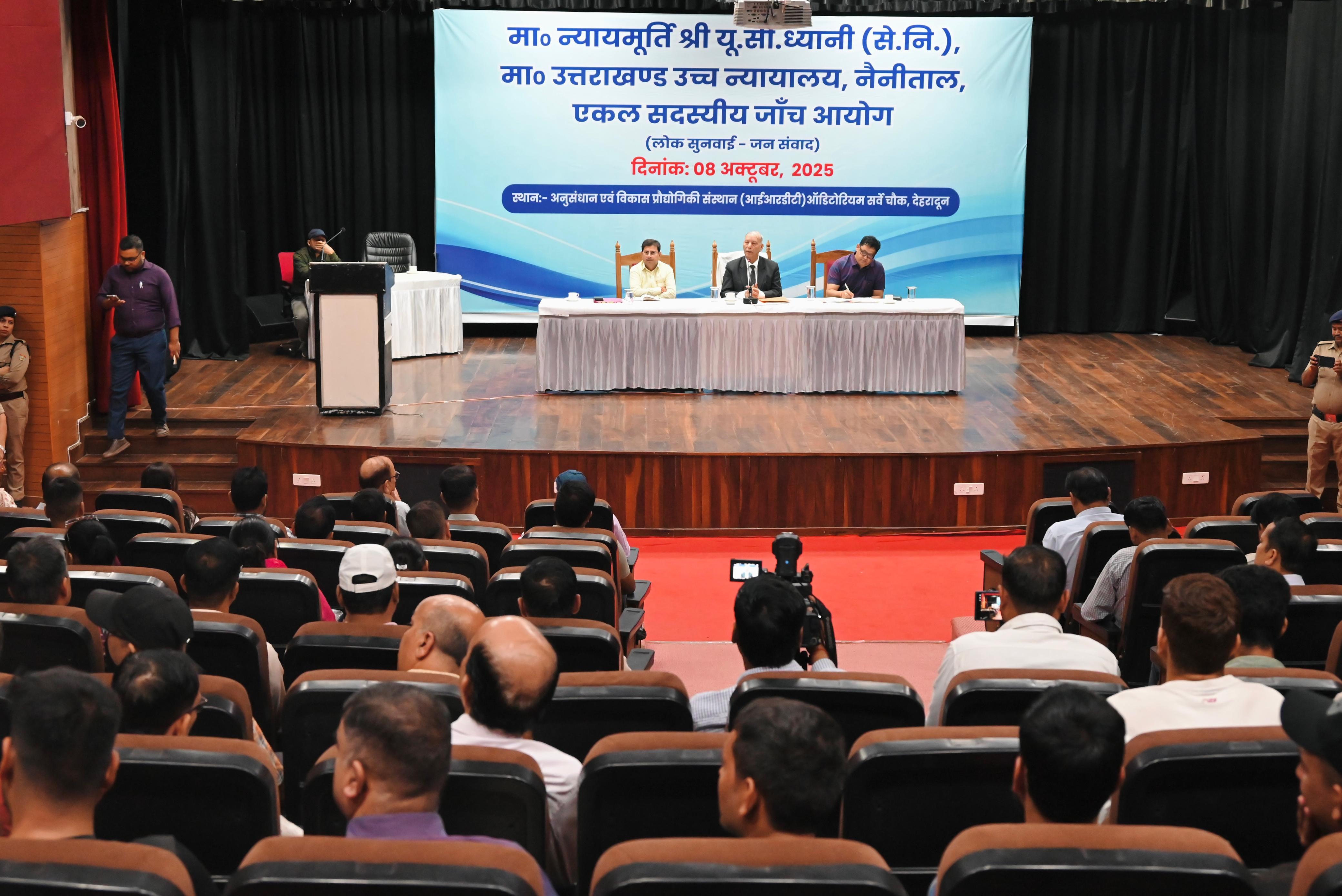 देहरादून : उत्तराखंड अधीनस्थ सेवा चयन आयोग की विगत 21 सितंबर,2025 को हुई प्रतियोगी परीक्षा में कथित गड़बड़ियों की जांच को लेकर राज्य सरकार द्वारा न्यायमूर्ति (सेवानिवृत्त) यू.सी. ध्यानी की अध्यक्षता में गठित एकल सदस्यीय जांच आयोग ने बुधवार को जनपद देहरादून के सर्वे चौक स्थित अनुसंधान एवं विकास प्रौद्योगिकी संस्थान (आईटीडीए) ऑडिटोरियम में लोक सुनवाई एवं जनसंवाद कार्यक्रम आयोजित किया। जिसमें प्रतियोगी परीक्षा में सम्मिलित अभ्यर्थियों, परीक्षा केंद्र प्रभारी, कोचिंग सेंटर संचालक और आम नागरिकों ने अपनी बात और सुझाव रखे।