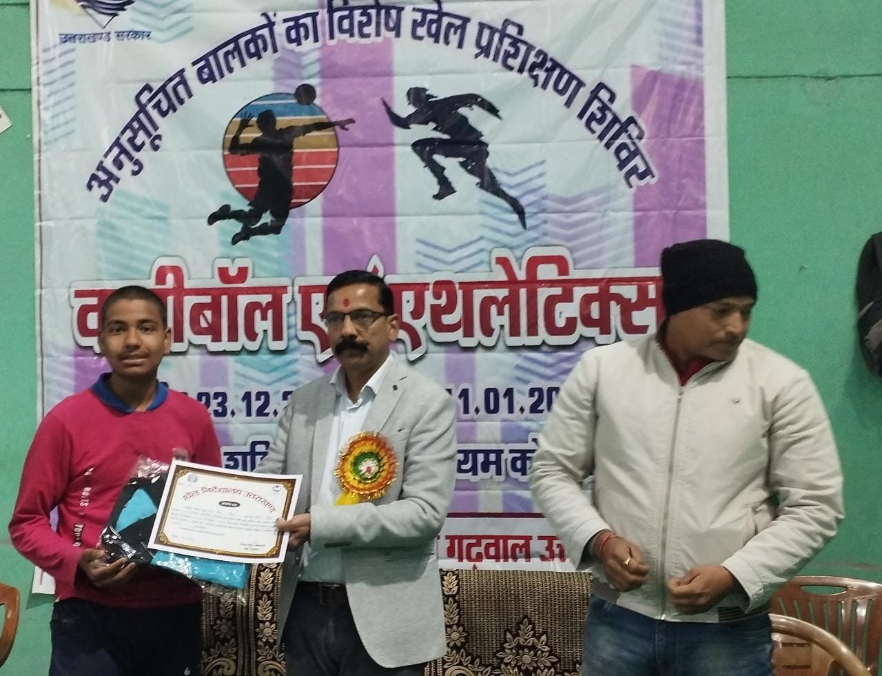 कोटद्वार । स्पेशल कंपोनेंट प्लान के अंतर्गत अनुसूचित बालकों का विशेष खेल प्रशिक्षण शिविर वालीबाल एवं एथलेटिक्टस 30 दिसंबर से 11 जनवरी तक शशिधर भट्ट स्टेडियम कोटद्वार में खेल विभाग की तरफ से आयोजित किया गया । खेल विभाग के इस 20 दिन के शिविर कैंप में 50 बच्चों ने बाॅलीबाल व एथलीट का प्रशिक्षण सम्पन्न किया । प्रशिक्षण ले रहे बच्चों को सर्टिफिकेट एवं ट्रैक सूट वितरित किए गए । इस अवसर पर मुख्य अतिथि सुमन कोटनाला, संजय डुकलान स्टेडियम प्रभारी, किक्रेट कोच सुधीर नेगी, बिक्रम सिंह, मान सिंह थापा आदि मौजूद रहे।