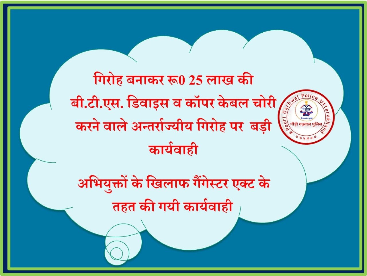 लैन्सडाउन/पौड़ी : वरिष्ठ पुलिस अधीक्षक पौड़ी श्वेता चौबे के निर्देशन में गिरोह बनाकर रूपये 25 लाख की बी.टी.एस. डिवाइस व कॉपर केबल चोरी करने वाले अन्तर्राज्यीय गिरोह पर बड़ी कार्यवाही। अभियुक्तों के खिलाफ गैंगेस्टर एक्ट के तहत की गयी कार्यवाही।वर्ष- 2022 में जनपद पौडी गढ़वाल के लैन्सडाउन, पाबौ (कोतवाली पौड़ी) तथा जनपद चमोली के थराली क्षेत्र में लगे मोबाईल टावर से बी.टी.एस. डिवाइस व कॉपर केबल चोरी की घटनायें घटित होने पर चोरी करने वाले शातिर गिरोह को जनपद की लैन्सडाउन पुलिस ने 12 सितम्बर 2022 को गिरफ्तार कर चोरी का माल बरामद होने पर अभियुक्तों को जेल भेजा गया था। उक्त गिरोह द्वारा बी.टी.एस. डिवाइस व कॉपर केबल की लगातार चोरी के अपराधों में संलिप्त रहकर अवैध धन अर्जित किया जा रहा था।