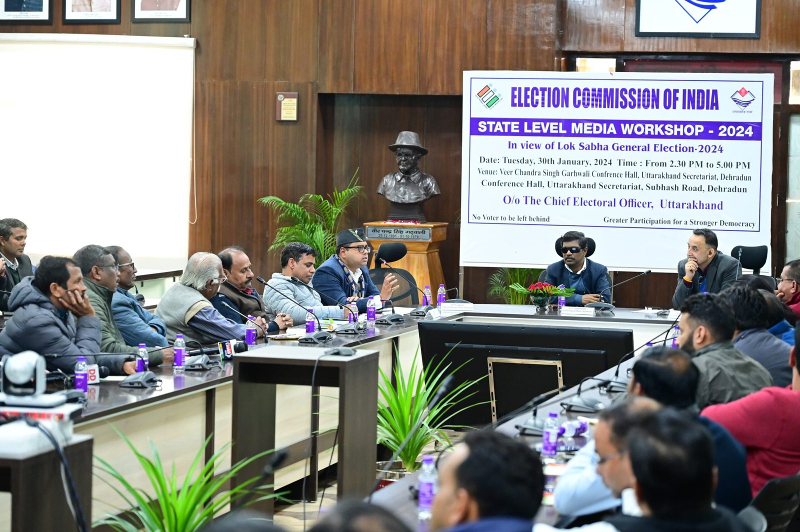 देहरादून : मुख्य निर्वाचन अधिकारी वी षणमुगम की अध्यक्षता में सचिवालय में राज्य स्तरीय मीडिया कार्यशाला 2024 आयोजित हुई । मुख्य निर्वाचन अधिकारी वी षणमुगम की अध्यक्षता में मंगलवार को सचिवालय में राज्य स्तरीय मीडिया कार्यशाला 2024 का आयोजन किया गया। कार्यशाला को संबोधित करते हुए मुख्य निर्वाचन अधिकारी वी षणमुगम ने कहा की निर्वाचन के दौरान मतदाता जागरुकता बढ़ाने,मतदान प्रतिशत बढ़ाने, जनमानस को निर्वाचन प्रक्रिया के प्रति जागरूक करने में मीडिया का अत्यंत महत्वपूर्ण उत्तरदायित्व है । मीडिया को लोकतंत्र का चौथा स्तंभ भी कहा गया है । अधिक से अधिक लोगो को मतदान के लिए प्रोत्साहित करने में मीडिया अपनी रचनात्मक भूमिका निभाएगा ऐसी आशा है । स्वीप गतिविधियों के तहत होने वाले जागरूकता कार्यों को मीडिया ही जन-जन तक पहुंचाने का कार्य करता है।