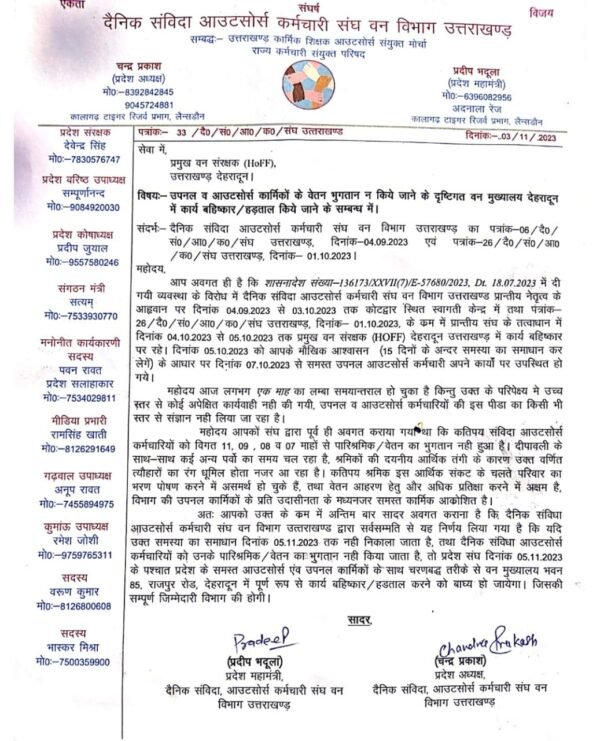 कोटद्वार। वन विभाग में उपनल व आउटसोर्स से रखे गए कर्मचारियों को पिछले माह से वेतन नहीं मिल पाया है, परिणमस्वरूप कर्मचारियों को आर्थिक समस्याओं का सामना करना पड़ रहा है। वेतन न मिलने से आक्रोशित कर्मचारियों ने आंदोलन की चेतावनी दी है। इस संबध में आयोजित बैठक में वक्ताओं ने कहा कि आउटसोर्स कर्मचारी ईमानदारी से अपने दायित्वों का निर्वहन कर रहे हैं, लेकिन इस पर भी वन विभाग की ओर से उन्हें पिछले नौ महीने से वेतन नहीं दिया गया है। इस कारण उन्हें परेशानी का सामना करना पड़ रहा है । कहा कि सबसे अधिक परेशानी किराए पर कमरा लेकर रह रहे कर्मचारियों को हो रही है। त्यौहारी सीजन पर भी उन्हें वेतन जारी न किया जाना उनके साथ विभाग की तानाशाही को दर्शाता है। मौके पर कर्मचारियों को शीघ्र वेतन जारी न किए जाने की स्थिति में आंदोलन की चेतावनी दी गई। बैठक में प्रदेश संरक्षक देवेंद्र सिंह, राम सिंह खाती, रोहित बड़थ्वाल, राजीव शर्मा, संदीप कुमार सहित अन्य कर्मचारी मौजूद रहे।