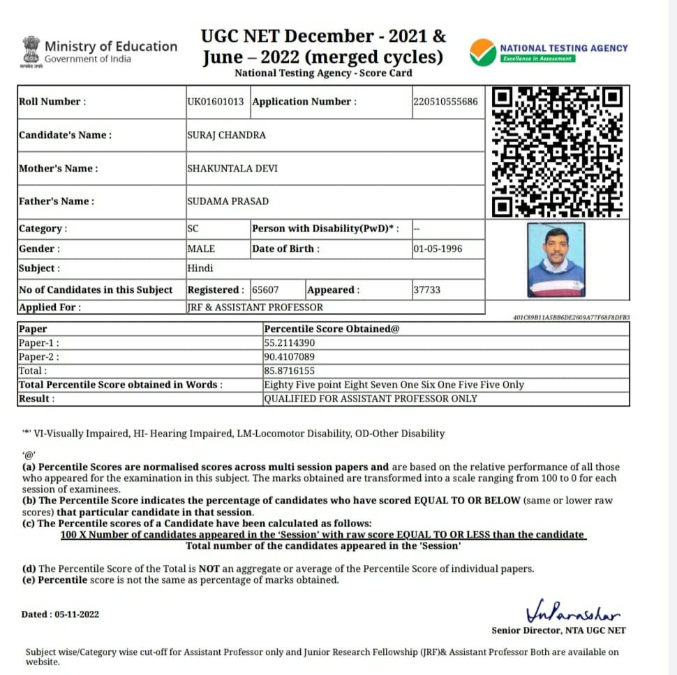 लैंसडाउन : भक्त दर्शन राजकीय स्नातकोत्तर महाविद्यालय ज़यहरीखाल में अध्ययनरत एमए हिंदी के छात्र सूरज चंद्र ने राष्ट्रीय स्तर पर आयोजित होने वाली UGC NET की परीक्षा उत्तीर्ण की l छात्र सूरज ने इसका श्रेय अपने कृषक पिता सुदामा प्रसाद और माता शकुंतला के साथ ही अपने गुरुजनों हिंदी विभाग के विभागाध्यक्ष डॉ. उमेश ध्यानी और डॉ. नीना शर्मा दिया l भक्त दर्शन राजकीय स्नातकोत्तर महाविद्यालय ज़यहरीखाल के छात्र की इस उपलब्धि से पूरे महाविद्यालय में खुशी का माहौल बना हुआ है सभी संकाय के प्राध्यापकों व छात्र छात्राओं ने छात्र सूरज चंद्र के साथ ही हिंदी विभाग के विभागाध्यक्ष डॉ ध्यानी और नीना शर्मा मैंम को भी उनके छात्र की इस उपलब्धि पर बधाई दी गईl
