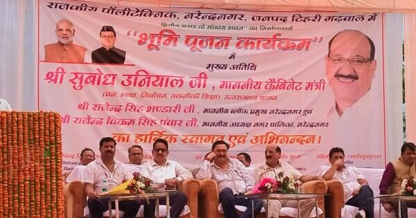 नरेन्द्र नगर : नाबार्ड योजना के अन्तर्गत राजकीय पॉलीटेक्निक नरेन्द्र नगर में द्वितीय फेज निर्माण कार्यो एवं डिजिटल लाइब्रेरी का भूमि पूजन कार्यक्रम आयोजित किया गया, जिसमें वन, भाषा, निर्वाचन एवं तकनीकी शिक्षा मंत्री सुबोध उनियाल, ब्लॉक प्रमुख नरेन्द्रनगर राजेन्द्र सिंह भण्डारी, नगरपालिका अध्यक्ष नरेन्द्रनगर राजेन्द्र विक्रम सिंह पंवार, निदेशक प्राविधिक शिक्षा आरपी गुप्ता, परीक्षा नियंत्रक प्राविधिक शिक्षा परिषद् डॉ. मुकेश पाण्डेय, कार्यदायी संस्था के सीजीएम सीएस रजवाण, प्रोजेक्ट मैनेजर अरविन्द सजवाण, संस्था प्रधानाचार्य आलोक मिश्रा की उपस्थिति में हुआ ।