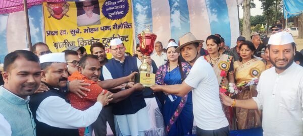 चंपावत : बनबसा के ग्राम भजनपुर में आयोजित प्रथम स्व.सूबेदार मोहन चंद स्मृति ग्रामीण क्रिकेट प्रतियोगिता के फाइनल मुकाबले में प्रदेश के मुख्यमंत्री पुष्कर सिंह धामी ने प्रतिभाग कर विजेता एवं उप विजेता टीमों को पुरस्कृत किया व विजेता मजगांव की टीम को 21 हजार तथा उप विजेता उचोलिगोठ की टीम को 11 हजार रुपये की धनराशि के चैक प्रदान किए। उन्होंने विजेता एवं उपविजेता टीमों को बधाई दी और उनके उज्ज्वल भविष्य की कामना की। उन्होंने कहा कि खेल का मैदान हमें अनुशासन सिखाने के साथ ही जीवन में हमें आगे बढ़ना सिखाता है। प्रतियोगिता में मजगांव बनबसा ने उचौलीगोठ टनकपुर को हराकर ट्राफी पर कब्जा किया l
