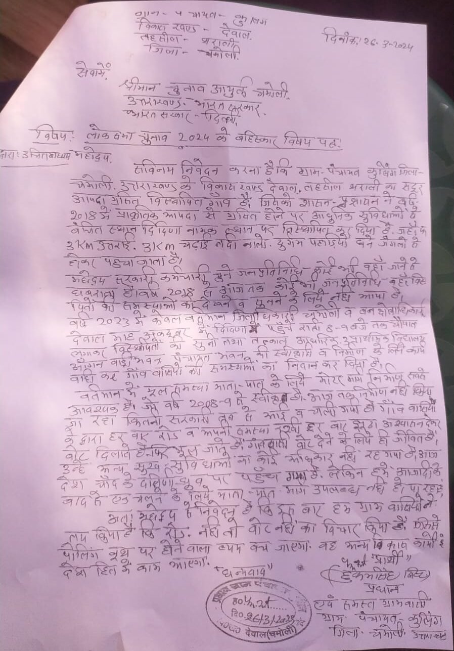 देवाल (चमोली)। चमोली जिले के देवाल विकास खंड के कुलिंग गांव से दिदिना तोक में विस्थापित ग्रामीणों के लिए वर्ष 2008-09 में स्वीकृत सड़क 15 साल बाद भी न बनने से ग्रामीणों ने रोष व्यक्त करते हुए बुधवार को उपजिलाधिकारी थराली के माध्यम से एक ज्ञापन चुनाव आयुक्त और जिला निर्वाचन अधिकारी को भेजकर लोक सभा चुनाव में मतदान न करने का एलान किया।