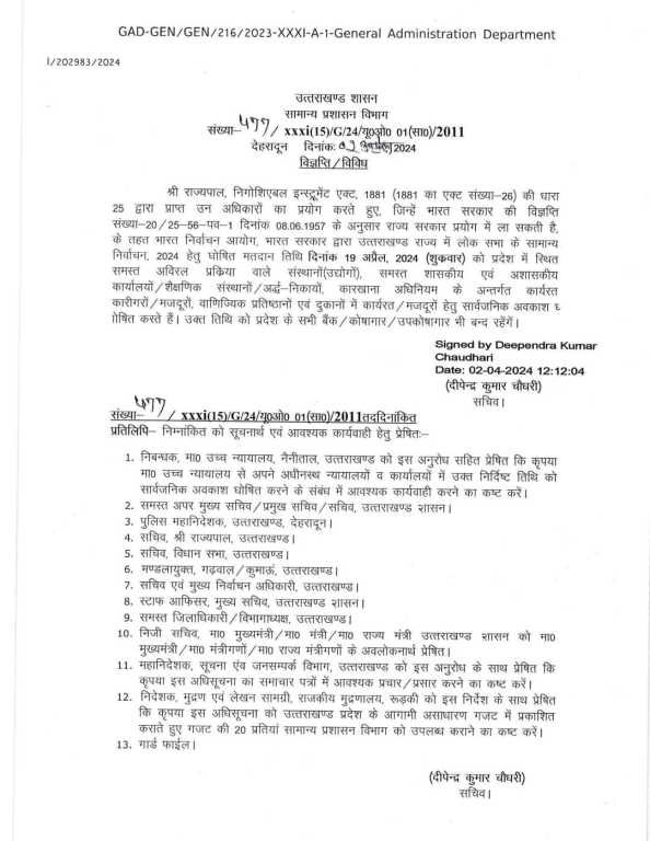 देहरादून : राज्यपाल, निगोशिएबल इन्स्ट्रूमेंट एक्ट, 1881 (1881 का एक्ट संख्या-26) की धारा 25 द्वारा प्राप्त उन अधिकारों का प्रयोग करते हुए, जिन्हें भारत सरकार की विज्ञप्ति संख्या-20/25-56-पव 1 दिनांक 08.06.1957 के अनुसार राज्य सरकार प्रयोग में ला सकती है, के तहत भारत निर्वाचन आयोग, भारत सरकार द्वारा उत्तराखण्ड राज्य में लोक सभा के सामान्य निर्वाचन, 2024 हेतु। घोषित मतदान तिथि दिनांक 19 अप्रैल, 2024 (शुक्रवार) को प्रदेश में स्थित समस्त अविरल प्रक्रिया वाले संस्थानों (उद्योगों), समस्त शासकीय एवं अशासकीय कार्यालयों/शैक्षणिक संस्थानों/अर्द्ध-निकायों, कारखाना अधिनियम के अन्तर्गत कार्यरत कारीगरों / मजदूरों, वाणिज्यिक प्रतिष्ठानों एवं दुकानों में कार्यरत / मजदूरों हेतु सार्वजनिक अवकाश गोषित करते हैं। उक्त तिथि को प्रदेश के सभी बैंक / कोषागार / उपकोषागार भी बन्द रहेंगें।