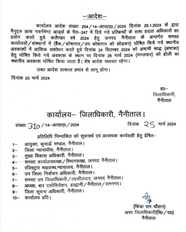 कार्यालय आदेश संख्या 204/14-आर0ए0/2024 दिनांक 25.1.2024 के द्वारा मैनुएल आफ गवर्नमेण्ट आर्ड्स के पैरा-247 में दिये गये प्रतिबन्धों के साथ प्रदत्त अधिकारों का प्रयोग करते हुये कलैण्डर वर्ष 2024 हेतु जनपद नैनीताल के अन्तर्गत समस्त कार्यालयों / संस्थानों में (बैंक / कोषागार/उप कोषागार को छोड़कर) घोषित किये गये स्थानीय अवकाशों में आंशिक संशोधन करते हुये दिनांक 24 सितम्बर 2024 को अष्टमी श्राद्ध (अष्टका) हेतु घोषित किये गये अवकाश के स्थान पर दिनांक 26 मार्च 2024 (मंगलवार) को होली का स्थानीय अवकाश घोषित किया जाता है। शेष आदेश यथावत रहेगा। उक्त आदेश तत्काल प्रभाव से लागू होगा।