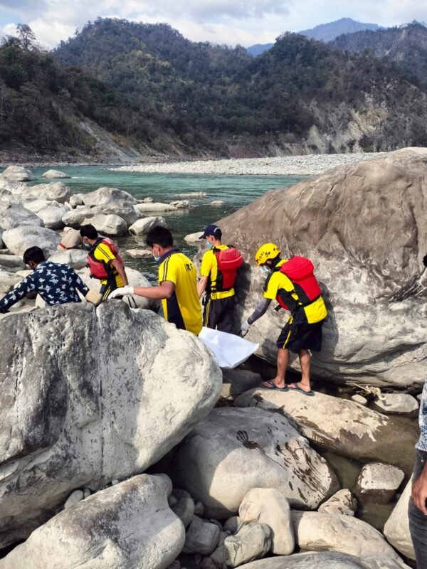 टनकपुर : जनपद चम्पावत- टनकपुर में नदी में दिखाई दिया अज्ञात शव, SDRF ने बरामद कर किया सिविल पुलिस के सुपर्द। आज 31 मार्च 2023 को थाना टनकपुर द्वारा SDRF टीम को सूचित किया गया कि ठुलीगाड़ के पास काली नदी में एक अज्ञात शव दिखाई दे रहा है जिसे बरामद किए जाने हेतु SDRF टीम की आवश्यकता है। उक्त सूचना पर पोस्ट टनकपुर से HC प्रवेश नगरकोटी के हमराह SDRF टीम तत्काल मोके के लिए रवाना हुई। SDRF टीम द्वारा घटनास्थल पर पहुँचकर सर्चिंग करते हुए नदी किनारे पत्थरों में फंसे अज्ञात पुरुष के शव को निकाल लिया गया तत्पश्चात बॉडी बैग व स्ट्रैचर के माध्यम से मुख्य मार्ग तक पहुँचाकर सिविल पुलिस के सुपर्द किया गया। सिविल पुलिस द्वारा उक्त शव के शिनाख्त की कार्यवाही की जा रही है।