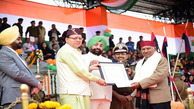 देहरादून : उत्तराखण्ड राज्य स्थापना दिवस के अवसर पर बुधवार को रेसकोर्स स्थित पुलिस लाईन में आयोजित मुख्य कार्यक्रम में राज्यपाल लेफ्टिनेंट जनरल गुरमीत सिंह (से. नि) एवं मुख्यमंत्री पुष्कर सिंह धामी ने प्रतिभाग किया। इस अवसर पर राज्यपाल ने रैतिक परेड का निरीक्षण कर सलामी ली। राज्यपाल ने विशिष्ट सेवाओं के लिए ‘राष्ट्रपति पुलिस पदक’ प्राप्त पुलिस अधिकारियों को सम्मानित भी किया। इस अवसर पर राज्यपाल एवं मुख्यमंत्री द्वारा उत्तराखण्ड पुलिस पत्रिका 2022 का विमोचन किया गया। नैनीताल जनपद की चोरगलिया थाने को सर्वश्रेष्ठ पुलिस थाने के रूप में सम्मानित किया गया।