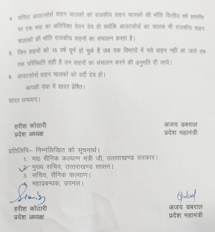 देहरादून : उत्तराखंड संविदा आउटसोर्स वाहन चालक संघ ने मुख्यमंत्री को ज्ञापन दिया है। उनका कहना है कि प्रदेश के संविदा/उपनल कर्मचारियों को 10 वर्ष पूर्ण करने वाले कर्मचारियों की विनियमितीकरण पॉलिसी उच्च न्यायालय से स्टे मुक्त हुई है। ज्ञापन में संविदा वाहन चालकों ने 6 सूत्रीय मांगों को पूरा करने का अनुरोध किया है।