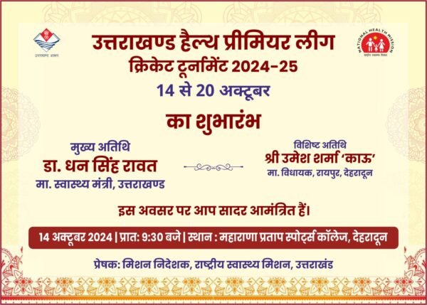 देहरादून । राष्ट्रीय स्वास्थ्य मिशन, स्वास्थ्य विभाग उत्तराखंड द्वारा एक अनूठी पहल के तहत राज्य में पहली बार उत्तराखंड हैल्थ प्रीमियर लीग (यू.एच.पी.एल.) क्रिकेट टूर्नामेंट का आयोजन 14 से 20 अक्टूबर तक महाराणा प्रताप स्पोर्ट्स कॉलेज में किया जा रहा है। इस टूर्नामेंट का उद्देश्य खेल के माध्यम से विभिन्न स्वास्थ्य विषयों पर जागरूकता फैलाना है। उत्तराखंड हैल्थ प्रीमियर लीग क्रिकेट टूर्नामेंट में प्रदेश के 8 विभाग भाग ले रहे हैं, और प्रत्येक विभाग एक विशेष स्वास्थ्य थीम के अंतर्गत खेलेंगे। इन थीमों के जरिए स्वास्थ्य के महत्वपूर्ण मुद्दों को समाज के समक्ष रखा जाएगा।