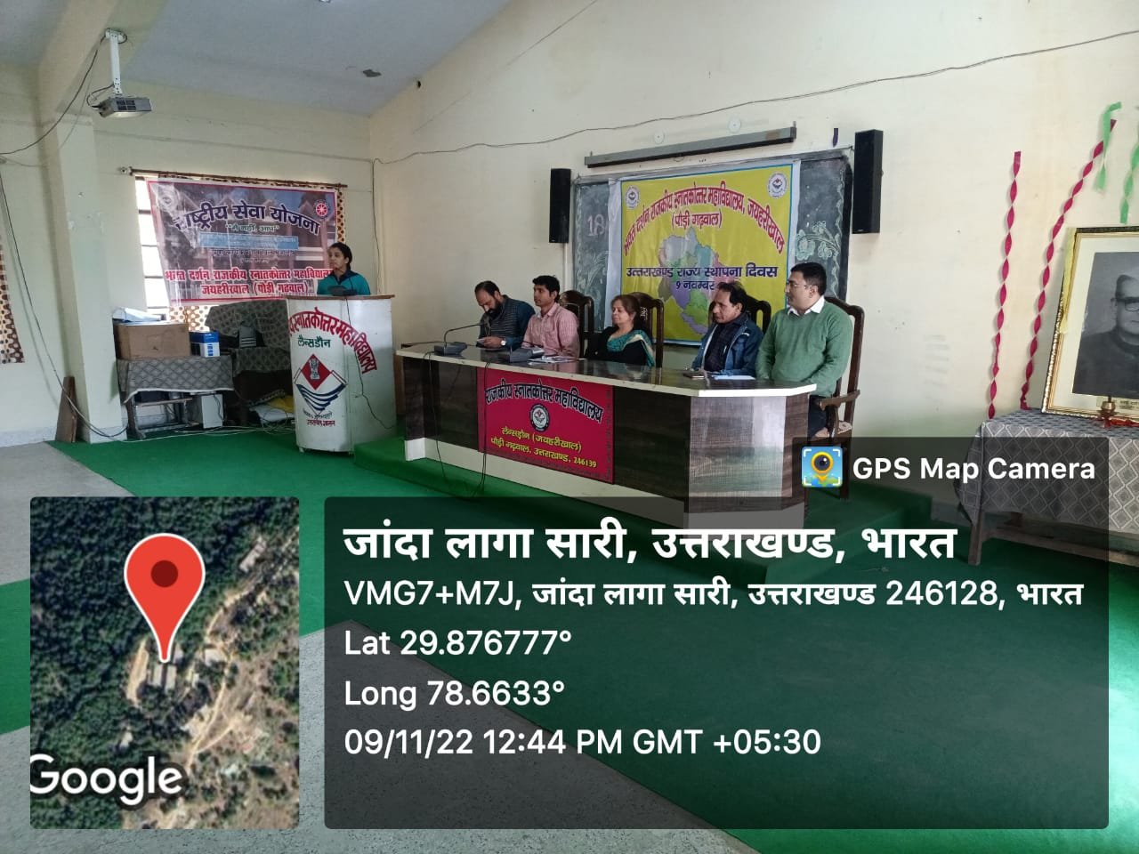 राज्य स्थापना दिवस के अवसर पर विभिन्न प्रतियोगिताओं ( वाद विवाद /निबंध/पोस्टर/रंगोली प्रतियोगिता) का आयोजन किया गया ।प्रतियोगिता में छात्र छात्राओं द्वारा बढ़ चढ़ कर प्रतिभाग किया गया । वाद विवाद प्रतियोगिता,(विकास/पर्यावरण संरक्षण उत्तराखंड परिपेक्ष में)में प्रथम, द्वितीय तथा तृतीय स्थान क्रमश: अंकित बुडाकोटी, नेहा तथा आयुषी ने प्राप्त किया। निबन्ध प्रतियोगिता (उत्तराखंड निर्माण के 22वर्ष उपलब्धि व चुनौतियां)में प्रथम, द्वितीय तथा तृतीय स्थान क्रमश: हेमन्त वेदवाल, दीपा तथा मिस्बाह ने प्राप्त किया। पोस्टर प्रतियोगिता(मेरी कल्पना का उत्तराखंड) में प्रथम, द्वितीय तथा तृतीय स्थान क्रमश: पूजा,सौरभ तथा मिस्बाह ने प्राप्त किया। रंगोली प्रतियोगिता(उत्तराखंड की संस्कृति)में प्रथम ,द्वितीय तथा तृतीय स्थान क्रमश: ग्रुप A, ग्रुप B तथा ग्रुप C द्वारा प्राप्त किया गया । छात्र सुभम बीएससी प्रथम वर्ष द्वारा योग की विभिन्न मुद्राओं की आकर्षक प्रस्तुति दी गई।