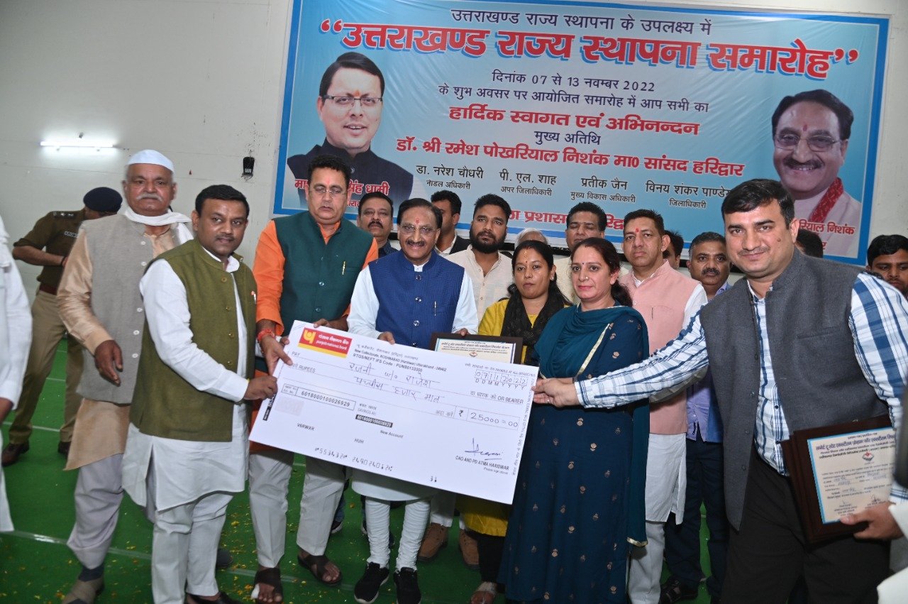 हरिद्वार : उत्तराखण्ड राज्य स्थापना के उपलक्ष्य में 07 से 13 नवम्बर,2022 तक राज्य स्थापना समारोह आयोजित करने के क्रम में बुधवार को ऋषिकुल सभागार में जिला प्रशासन द्वारा राज्य स्थापना दिवस का आयोजन किया गया, जिसका शुभारम्भ दीप प्रज्ज्वलित कर मुख्य अतिथि हरिद्वार सांसद डॉ. रमेश पोखरियाल ’निशंक’ ने किया। कार्यक्रम को सम्बोधित करते हुये हरिद्वार सांसद डॉ. रमेश पोखरियाल ’निशंक’ ने राज्य स्थापना की बधाई एवं शुभकामनायें देते हुये कहा कि आज मां गंगा के तट पर हम सभी राज्य स्थापना दिवस मनाने के लिये एकत्रित हुये हैं। उन्होंने जनपद की प्रशासनिक टीम की कार्य करने की शैली की प्रशंसा करते हुये कहा कि जनपद ने विभिन्न क्षेत्रों में प्रदेश का ही नहीं, बल्कि देश का नाम रोशन किया है। उन्होंने कहा कि आज हरिद्वार उत्तराखण्ड का नम्बर-1 जिला है। यह हरि का द्वार है तथा इसी हरिद्वार में गांधी जी को महात्मा की उपाधि दी गयी थी। यह शिक्षा का हब है तथा पिछले आठ वर्षों में कानून-व्यवस्था के क्षेत्र में भी यहां अपराधों पर पूरी तरह लगाम लगी है।