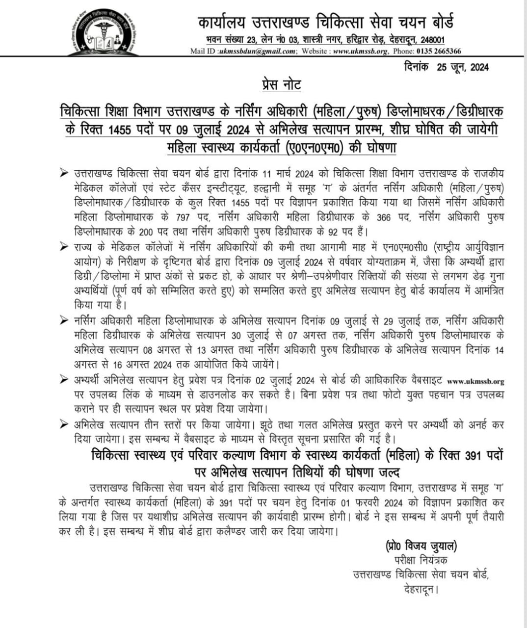 राज्य के मेडिकल कॉलेजों में नर्सिंग अधिकारियों की कमी तथा आगामी माह में एन०एम०सी० (राष्ट्रीय आर्युविज्ञान आयोग) के निरीक्षण के दृष्टिगत बोर्ड द्वारा दिनांक 09 जुलाई 2024 से वर्षवार योग्यताक्रम में, जैसा कि अभ्यर्थी द्वारा डिग्री / डिप्लोमा में प्राप्त अंकों से प्रकट हो, के आधार पर श्रेणी-उपश्रेणीवार रिक्तियों की संख्या से लगभग डेढ़ गुना अभ्यर्थियों (पूर्ण वर्ष को सम्मिलित करते हुए) को सम्मलित करते हुए अभिलेख सत्यापन हेतु बोर्ड कार्यालय में आमंत्रित किया गया है नर्सिंग अधिकारी महिला डिप्लोमाधारक के अभिलेख सत्यापन दिनांक 09 जुलाई से 29 जुलाई तक, नर्सिंग अधिकारी महिला डिग्रीधारक के अभिलेख सत्यापन 30 जुलाई से 07 अगस्त तक, नर्सिंग अधिकारी पुरुष डिप्लोमाधारक के अभिलेख सत्यापन 08 अगस्त से 13 अगस्त तथा नर्सिंग अधिकारी पुरुष डिग्रीधारक के अभिलेख सत्यापन दिनांक 14 अगस्त से 16 अगस्त 2024 तक आयोजित किये जायेंगे अभ्यर्थी अभिलेख सत्यापन हेतु प्रवेश पत्र दिनांक 02 जुलाई 2024 से बोर्ड की आधिकारिक वैबसाइट www.ukmssh.org पर उपलब्ध लिंक के माध्यम से डाउनलोड कर सकते है। बिना प्रवेश पत्र तथा फोटो युक्त पहचान पत्र उपलब्ध कराने पर ही सत्यापन स्थल पर प्रवेश दिया जायेगा अभिलेख सत्यापन तीन स्तरों पर किया जायेगा। झूठे तथा गलत अभिलेख प्रस्तुत करने पर अभ्यर्थी को अनर्ह कर दिया जायेगा। इस सम्बन्ध में वैबसाइट के माध्यम से विस्तृत सूचना प्रसारित की गई है।