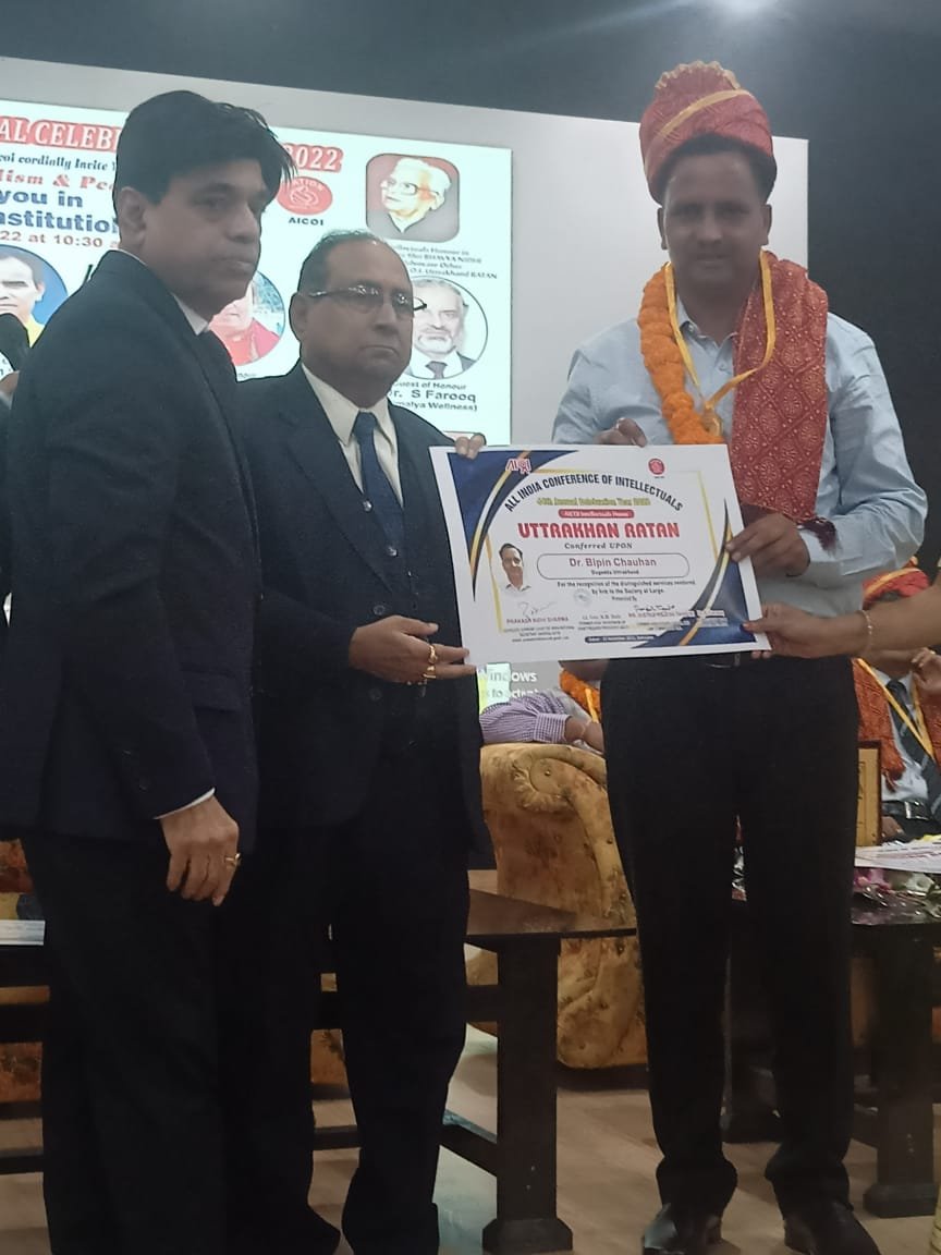 कोटद्वार । राजकीय उच्च प्राथमिक विद्यालय उमरैला में कार्यरत कोटद्वार निवासी शिक्षक विपिन चौहान को स्वयंसेवी संस्था अखिल भारतीय बुद्धिजीवी सम्मेलन उत्तराखंड रत्न पुरस्कार से नवाजा गया। रविवार को संस्था के 44 वे वार्षिक सम्मेलन का आयोजन देहरादून में किया गया। संस्था ने विपिन चौहान को यह पुरस्कार मानवता, राष्ट्रीय और शांति के सिद्धान्तों को अपनाने और इनके अनुसार समाज में अपना योगदान प्रदान करने के लिए दिया गया। विपिन चौहान ने जन शिक्षा के क्षेत्र में विद्यार्थियों के लिए अनेक महत्वपूर्ण कार्य किए हैं। जिसके आधार पर संस्था ने विपिन चौहान को सम्मानित किया है ।