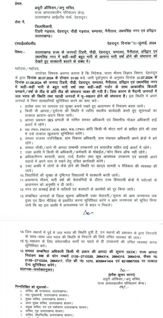 - समस्त सम्बन्धित अधिकारी किसी भी प्रकार की आपदा की सूचना SEOC/ राज्य आपदा नियंत्रण कक्ष के फोन नम्बरों 0135-2710335, 2664314, 2664315, 2664316, फैक्स नं० 0135-2710334, 2664317, टोल फ्री नं0 1070, 9058441404 एवं 8218867005 पर तत्काल देना सुनिश्चित करेंगे।