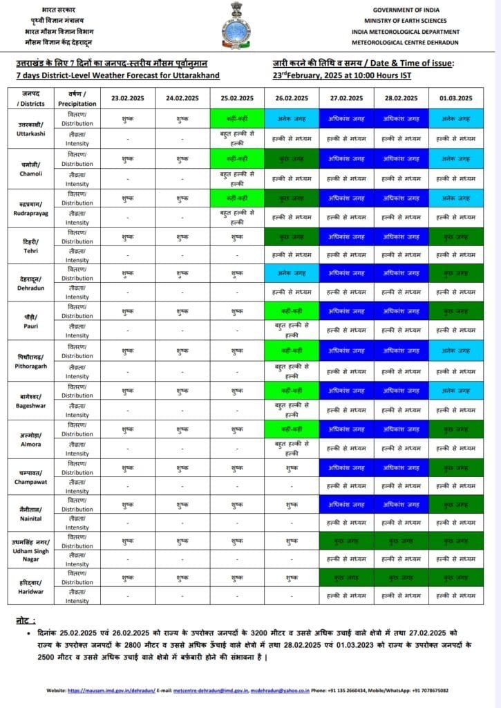 मौसम विभाग के पूर्वानुमान के मुताबिक, 27 और 28 फरवरी को उत्तराखंड के ज्यादातर हिस्सों में बारिश होने की संभावना है। लगातार बारिश के कारण तापमान में गिरावट होगी और ठंड बढ़ सकती है। बारिश के कारण मैदानी इलाकों में जलभराव की स्थिति बन सकती है, जबकि पहाड़ी क्षेत्रों में भूस्खलन का खतरा रहेगा।